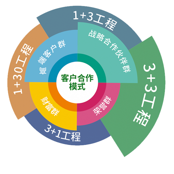 創新打造出獨特的“133-130”工(gong)程(cheng)(cheng),圍繞(1+3工(gong)程(cheng)(cheng)、3+3工(gong)程(cheng)(cheng)、3+1工(gong)程(cheng)(cheng)、1+30工(gong)程(cheng)(cheng))與客戶(hu)群(qun)(客戶(hu)群(qun)、財富群(qun),榮譽群(qun)、戰略合(he)作伙(huo)伴(ban)群(qun)等)兩大基(ji)點構(gou)建系統化合(he)作模式,建構(gou)市場(chang)合(he)作伙(huo)伴(ban),服務客戶(hu),為企(qi)業發(fa)展保駕護航。
